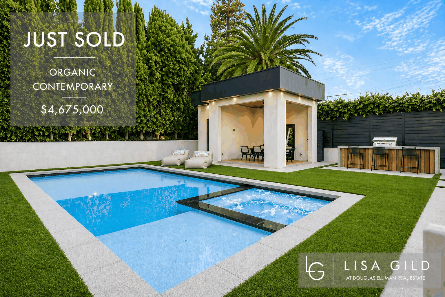 Designed for both elevated living and effortless entertaining, the chef’s kitchen flows into spacious living and dining areas, while floor-to-ceiling glass doors open to a private backyard with pool, spa, and cabana—perfect for the California lifestyle.